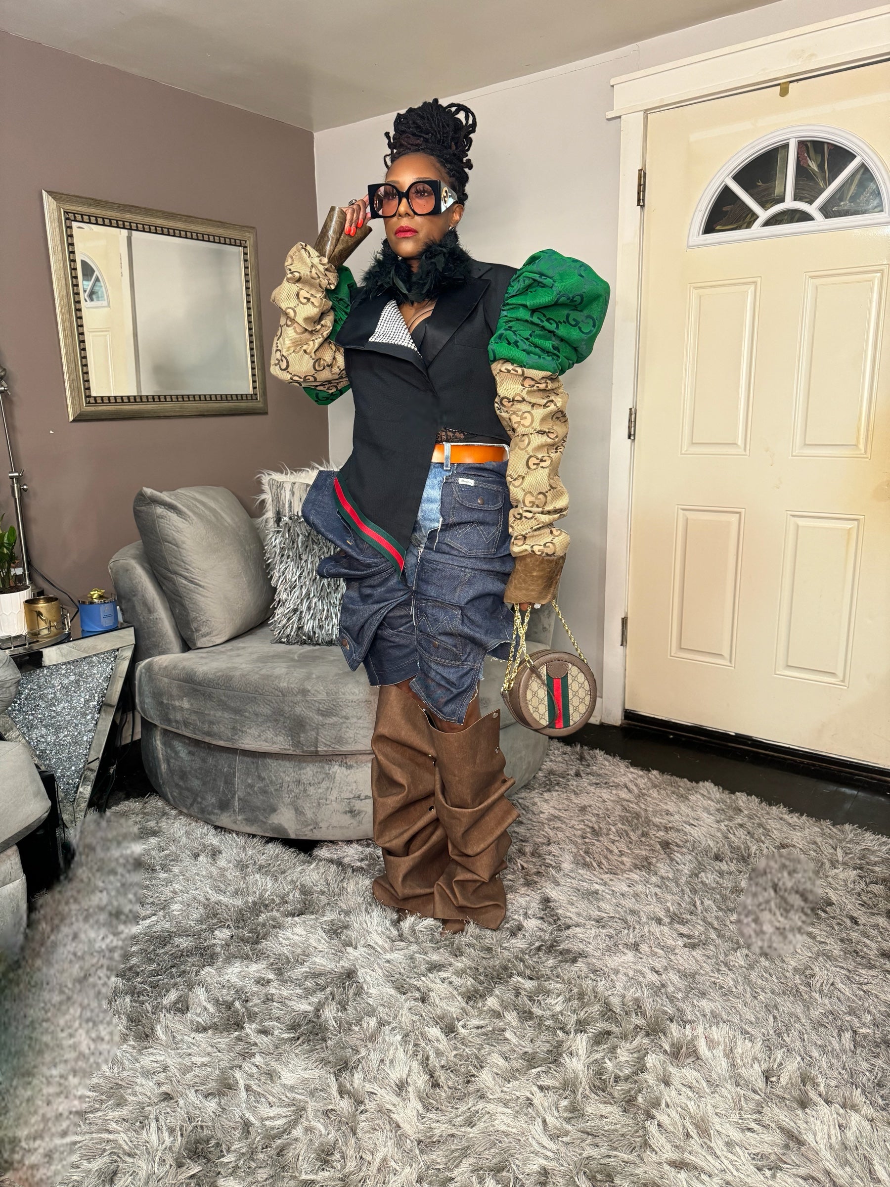 Indulge in the opulence of our Big GG Insp. Couture Tuxedo Jacket. Handcrafted with luxe materials, this asymmetrical blazer exudes sophistication and exclusivity. The leather embellishments add a touch of boldness to this designer inspired piece. Elevate your style with this couture sleeve blazer.