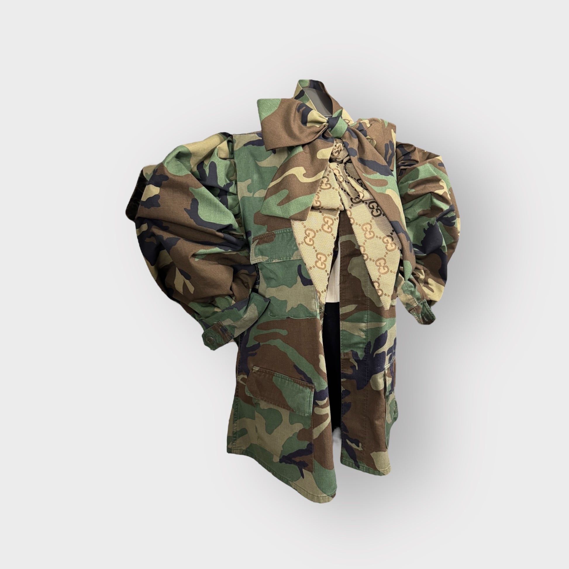 (Made to order) Camo Double Power Bow Puff Sleeve Shacket