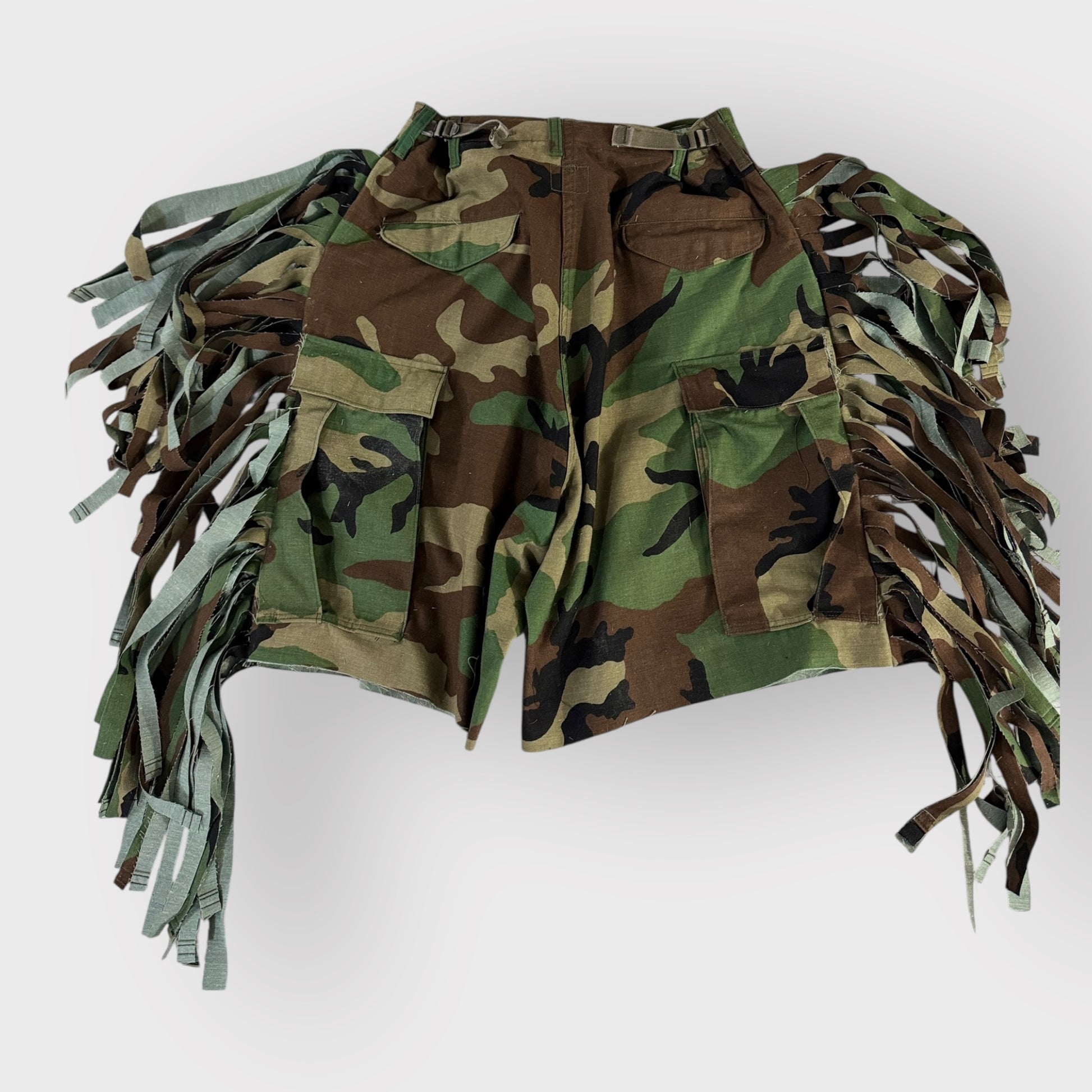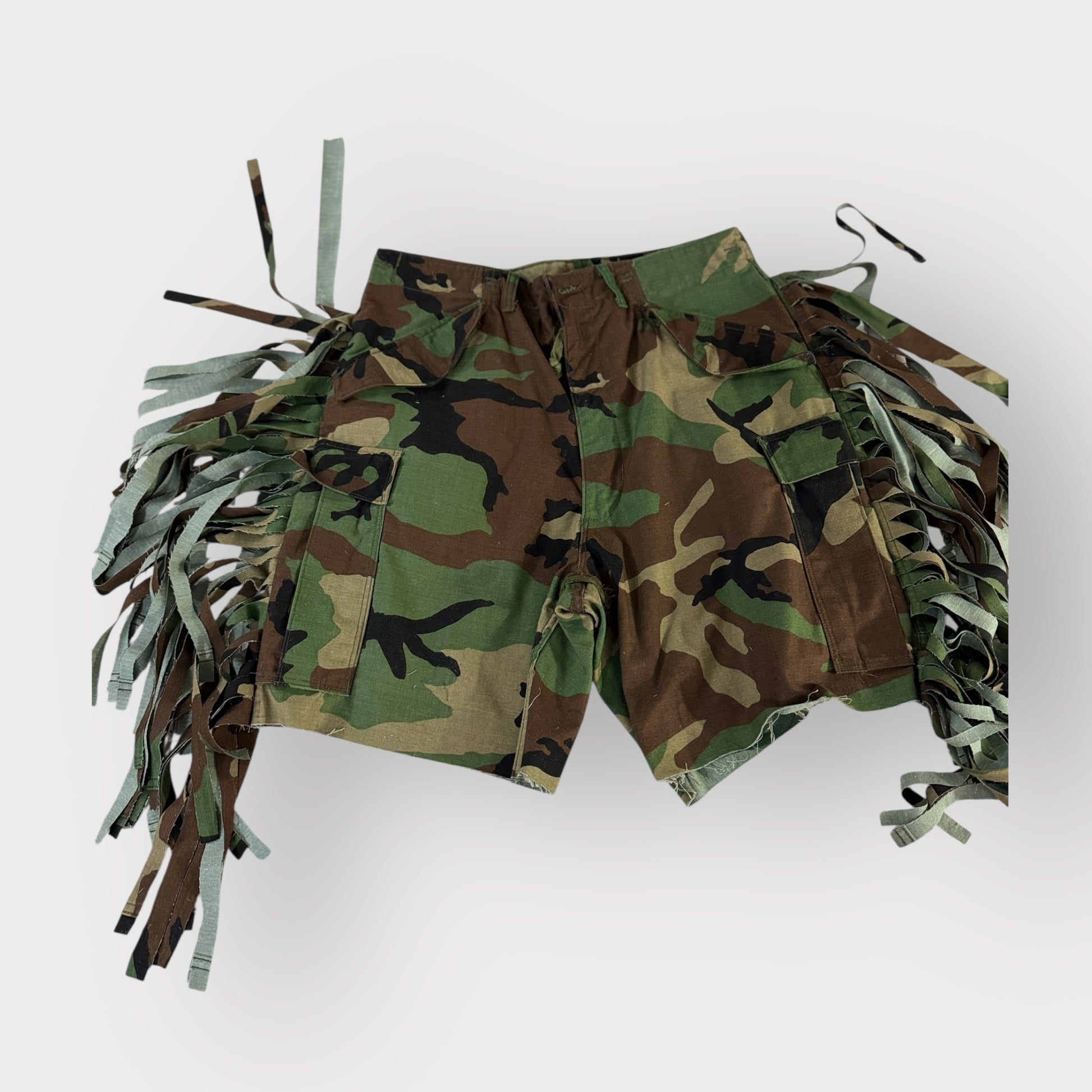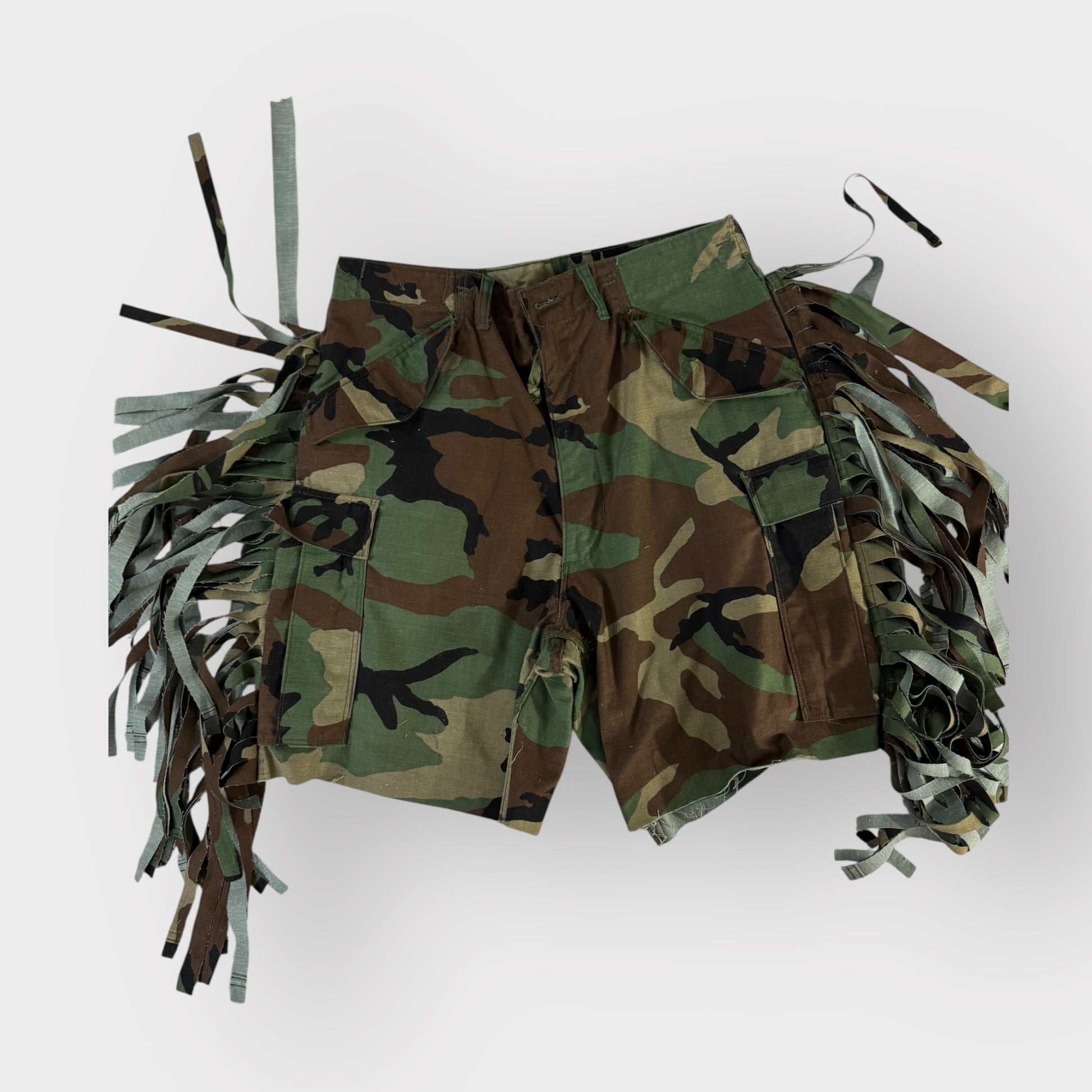 Embrace the wild side with our Camo Fringe Bermuda's. These custom camo shorts add a touch of rugged luxury to your western-inspired wardrobe. The playful fringe detail adds a touch of fun to these stylish and exclusive shorts. Perfect for the modern adventurer.