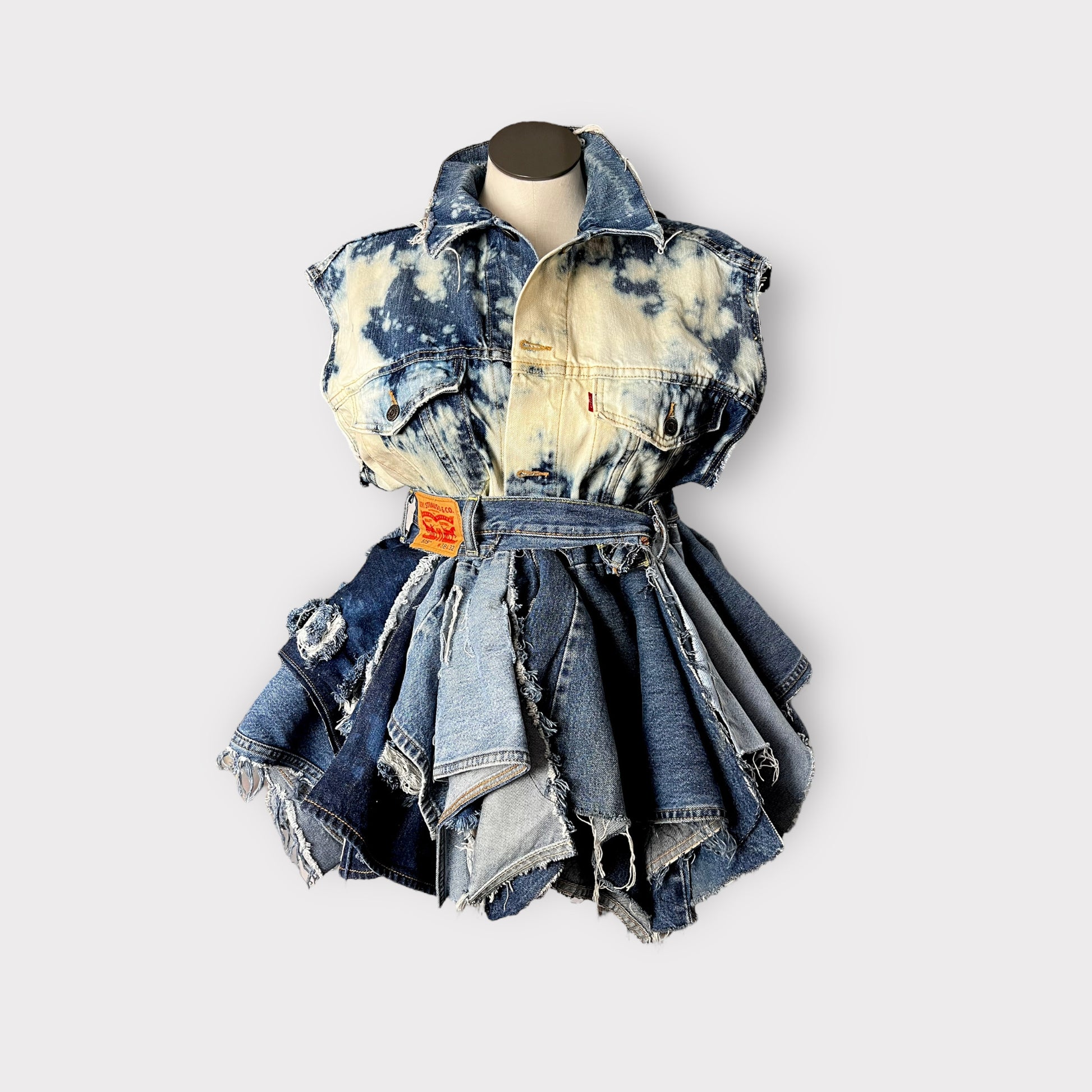 This distressed denim peplum top effortlessly combines edgy distressing with a feminine layered peplum silhouette. Elevate any outfit with its versatile design - wear it as a top or a dress, depending on your body type and desired fit. The perfect addition to any stylish wardrobe.