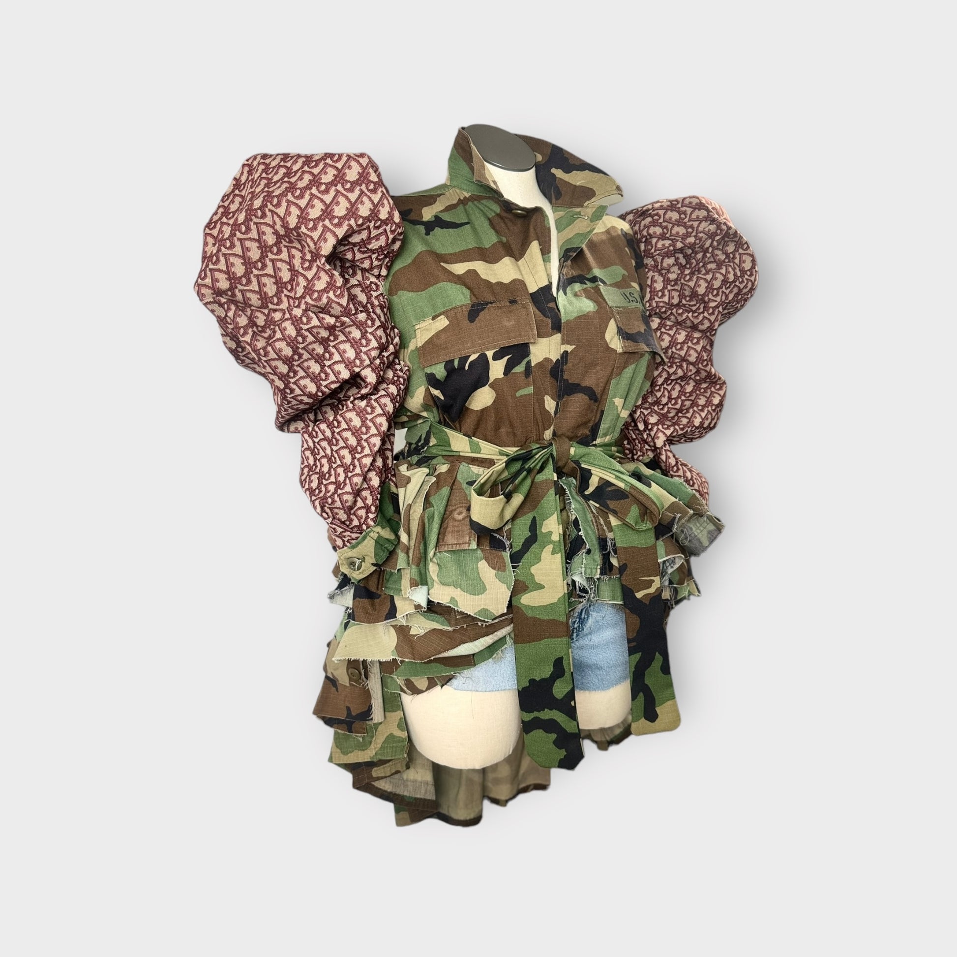 Indulge in pure luxury with our Luxe Peacock Tuxe Tail Camo coat. Featuring a designer-inspired couture puff sleeves, this sophisticated street couture piece is sure to make you a showstopper. The ruffle peacock tuxe tail adds an artistic touch, perfect for the fashion-forward individual. Elevate your wardrobe and make a statement with this exclusive coat.
