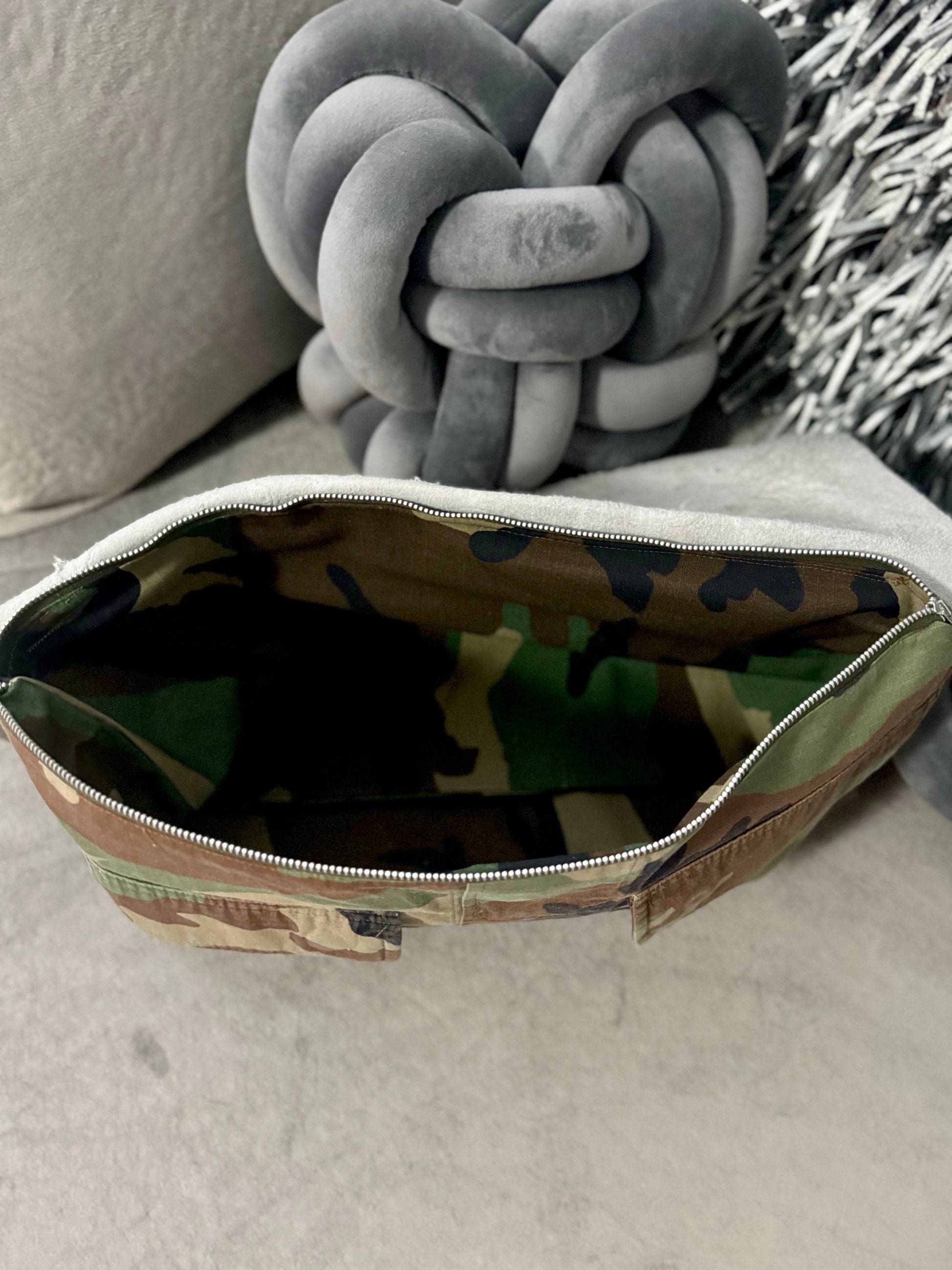 Custom made with exquisite camo and cowhide, this oversized exudes sophistication and exclusivity. Perfect for any occasion, it's the ideal blend of country charm and high-end style. Handcrafted from vintage and premium camo fabric and elevated with shimmering gold sparkle leather accents, this one-of-a-kind piece is designed to turn heads.